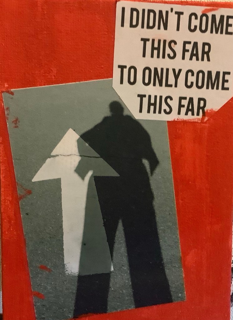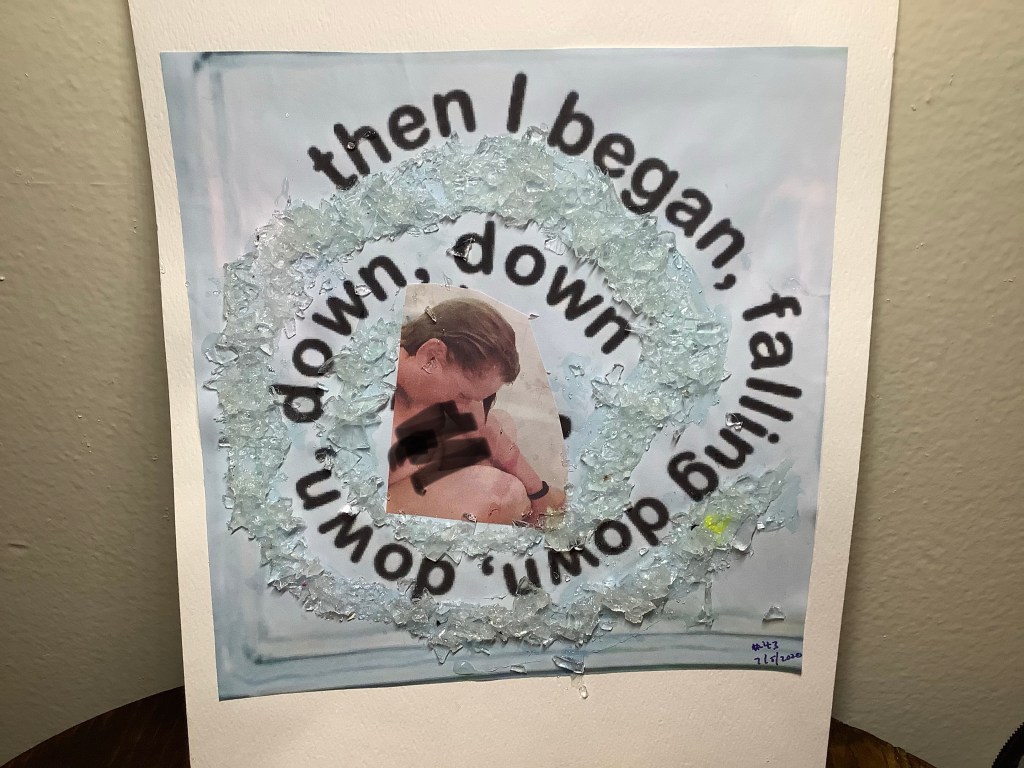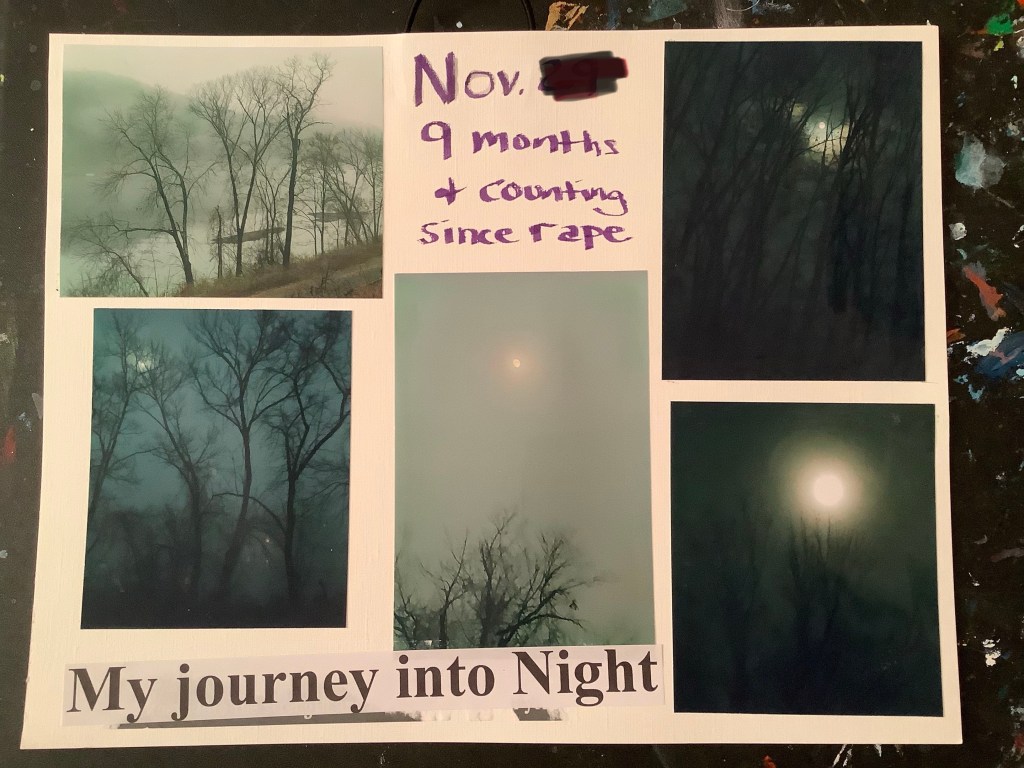 I took the photos of the flowers and then transposed myself amongst them trying to put a “positive spin” on all my sorrow and grief. One time while feeling down, I took a walk and took photos of objects and nature that matched my mood. It actually helped! I discovered beauty in the brokenness that surrounded me and encompassed me.I was soon glad after that night that “fate didn’t bite.”To borrow from Alice in Wonderland, I can feel like I’m falling down the rabbit hole, which in this case is covered with glass shards. I am getting better at identifying when I feel I am beginning to spiral down and can reach out before things get too dark. More from Alice in Wonderland Photographs I took while walking at night. This whole experience has felt like a journey into night, so I tried to “embrace” the darkness or at least try to find a way to learn to live with it. A frightening process piece.